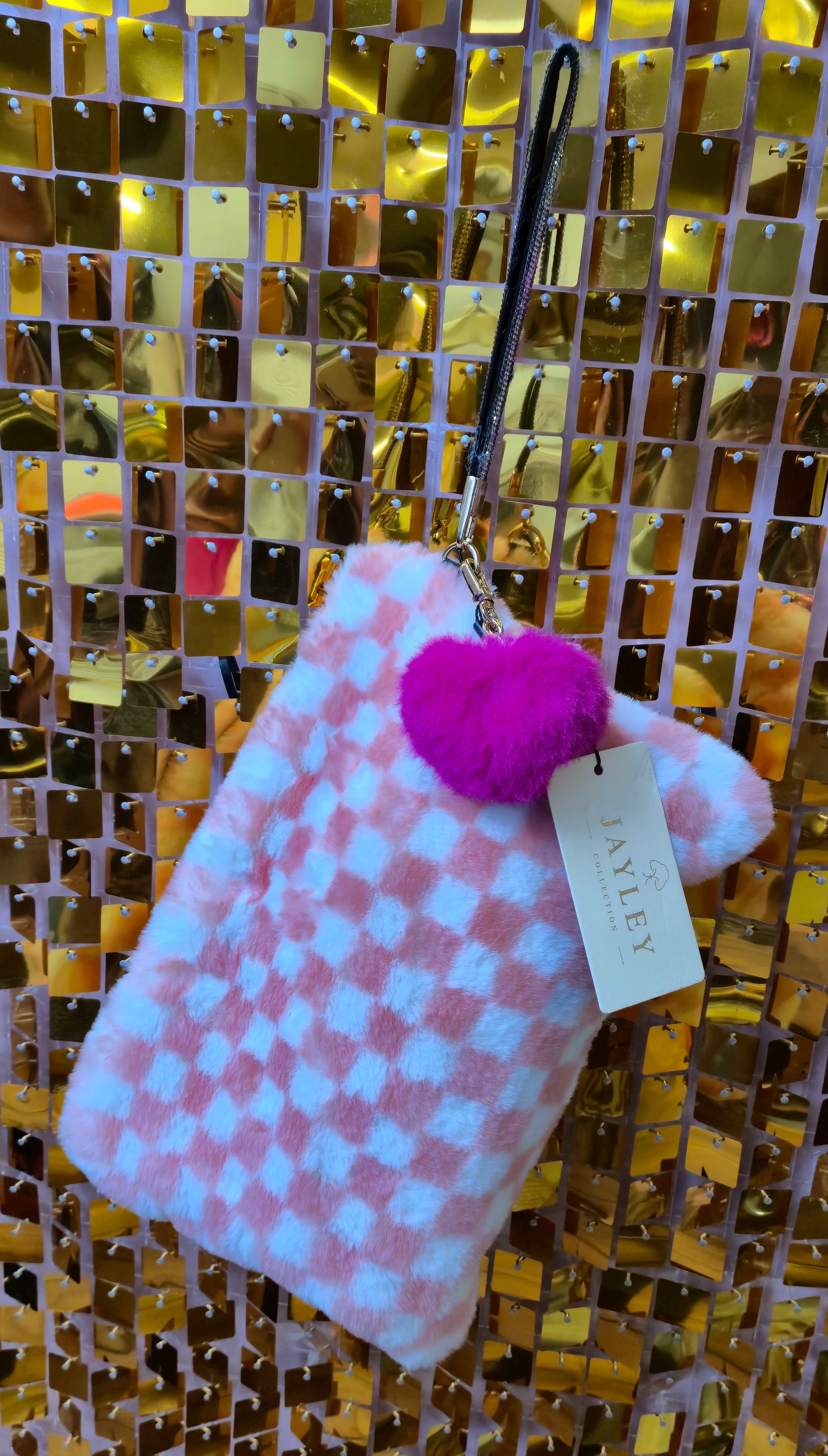 Checked, pink & white design with fluffy heart keyring attached. Large size with diamanté wrist strap.