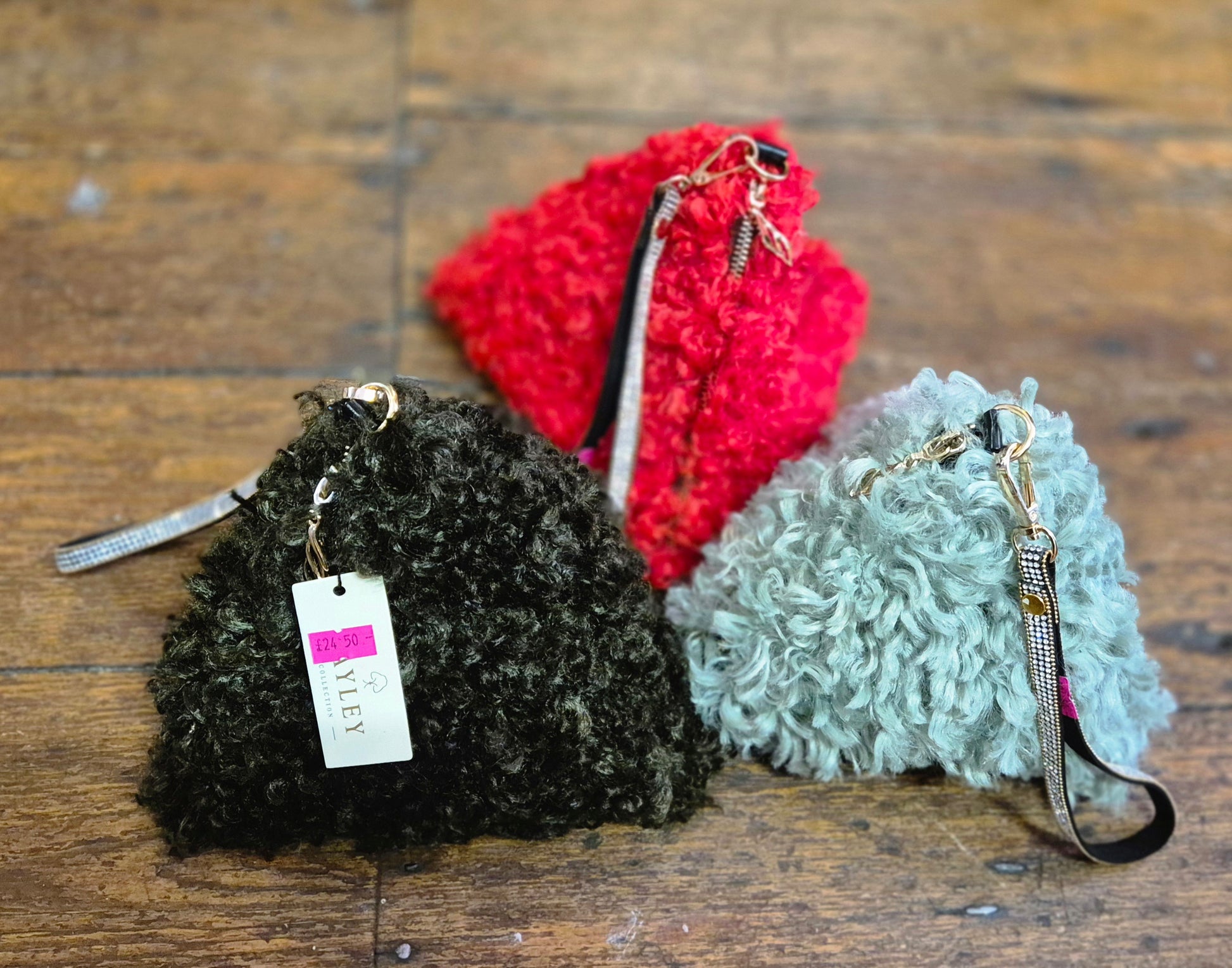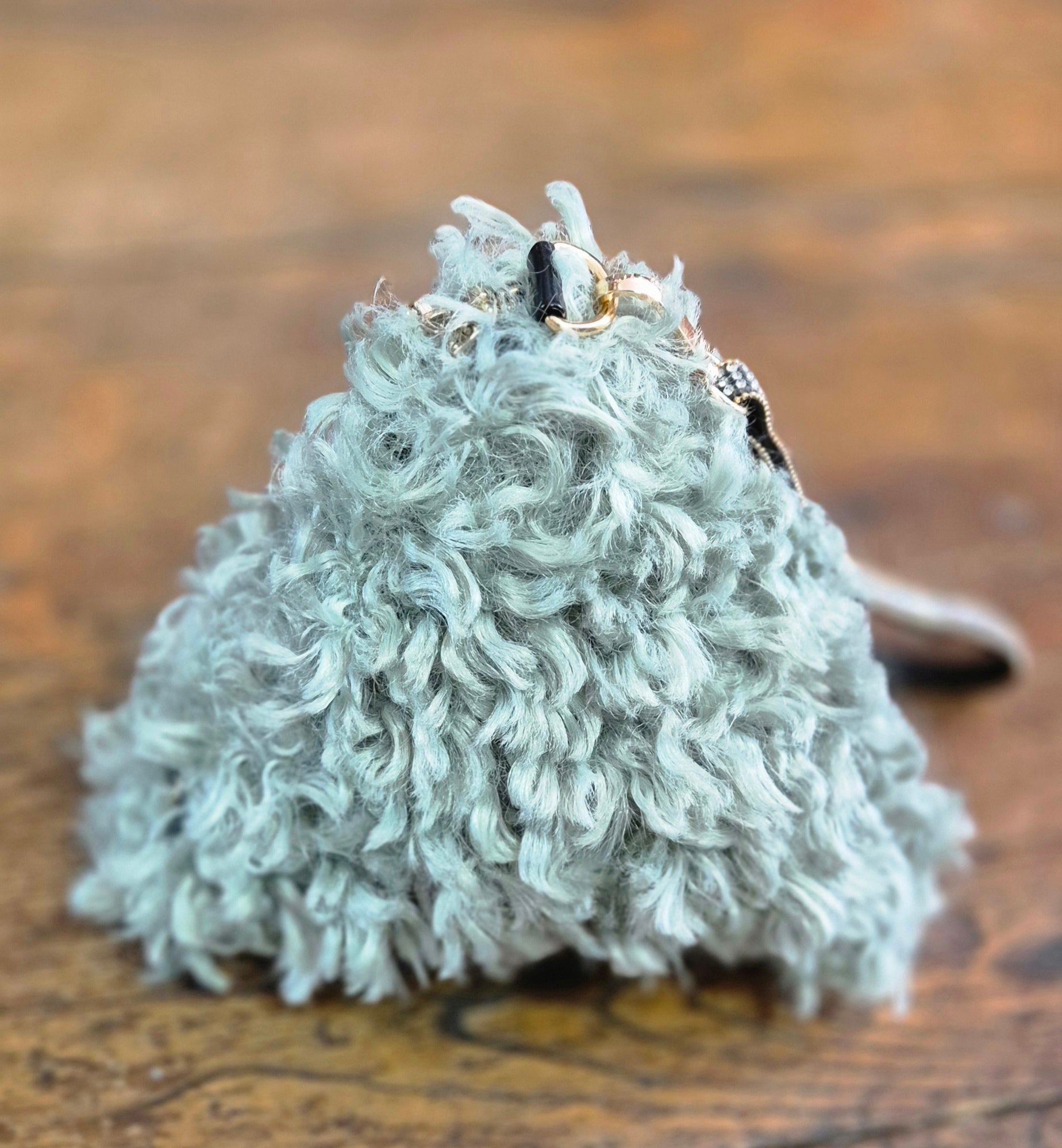 Small fluffy pyramid bag with diamanté wrist-strap. Neat little size (H17cm/W20cm). A fun edition to your clutch bag collection.