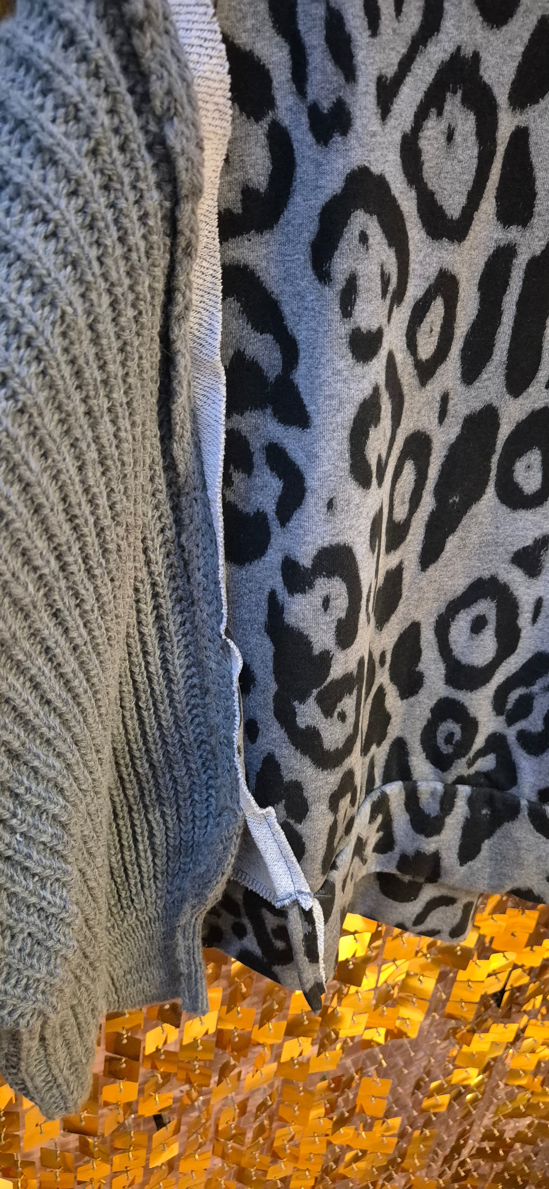 A trendy, oversized Leopard Print Sweater with knitted sleeves and lower side splits.
