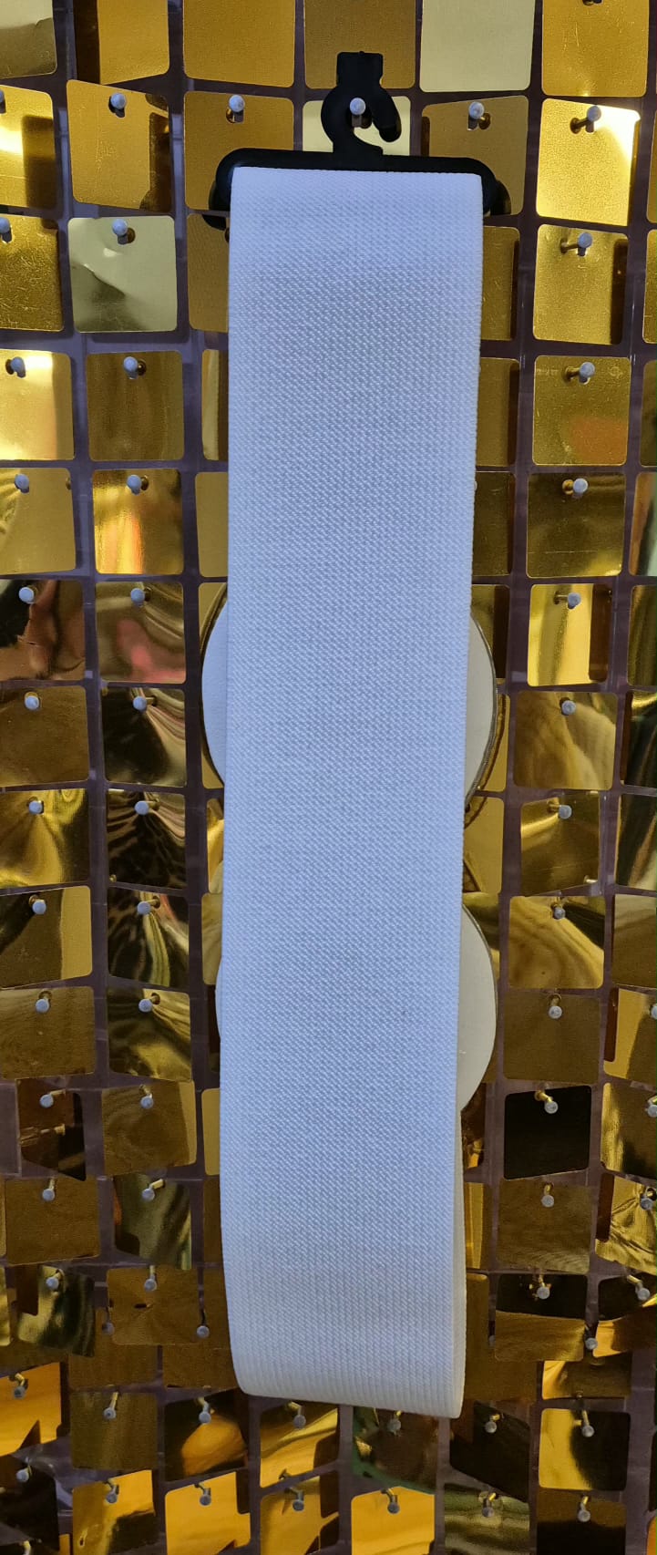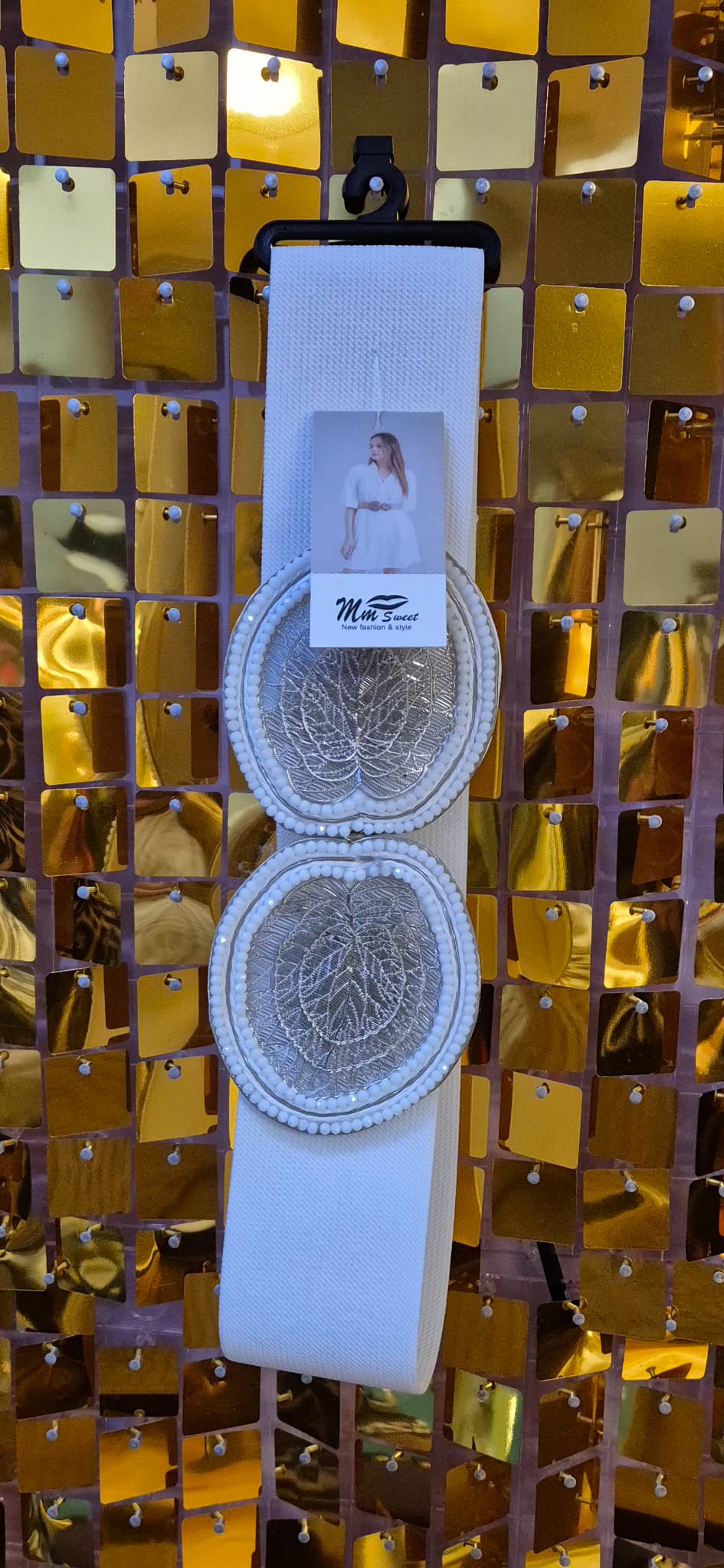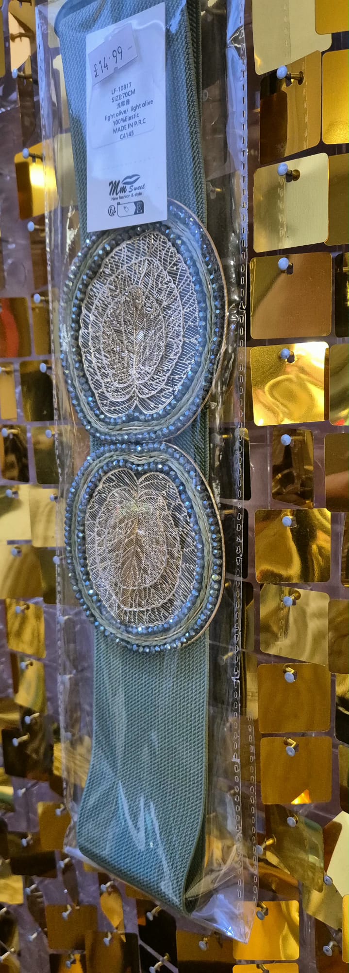 Front clasp , Elasticated body, onesize stunning belts. Gold detail on olive and silver detail on white .