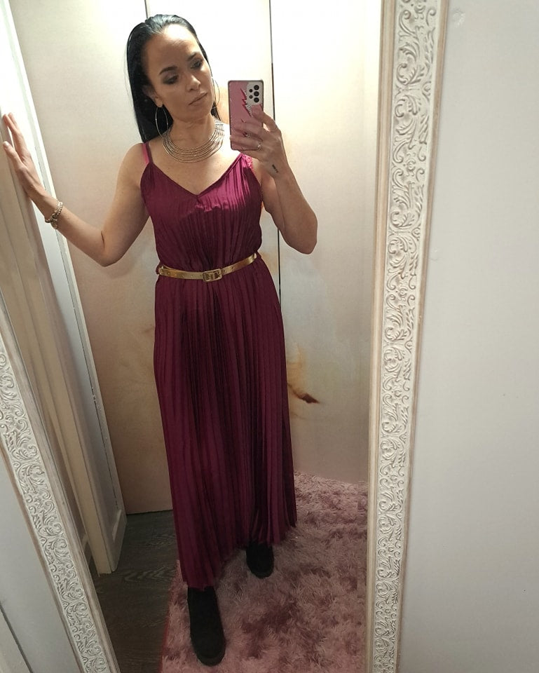 Satin pleated midi dress will fit between 8/14 available in raspberry,green,navy,champagne and blue.